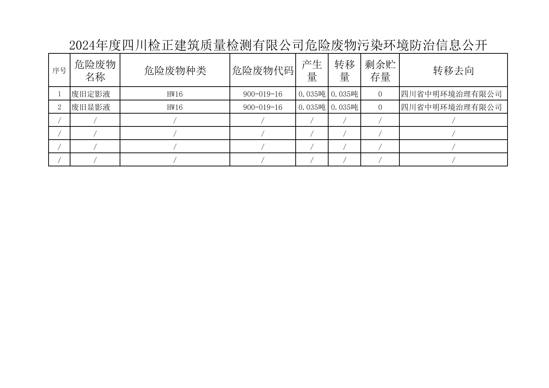 2024年度四川检正建筑质量检测有限公司危险废物污染环境防治信息公开